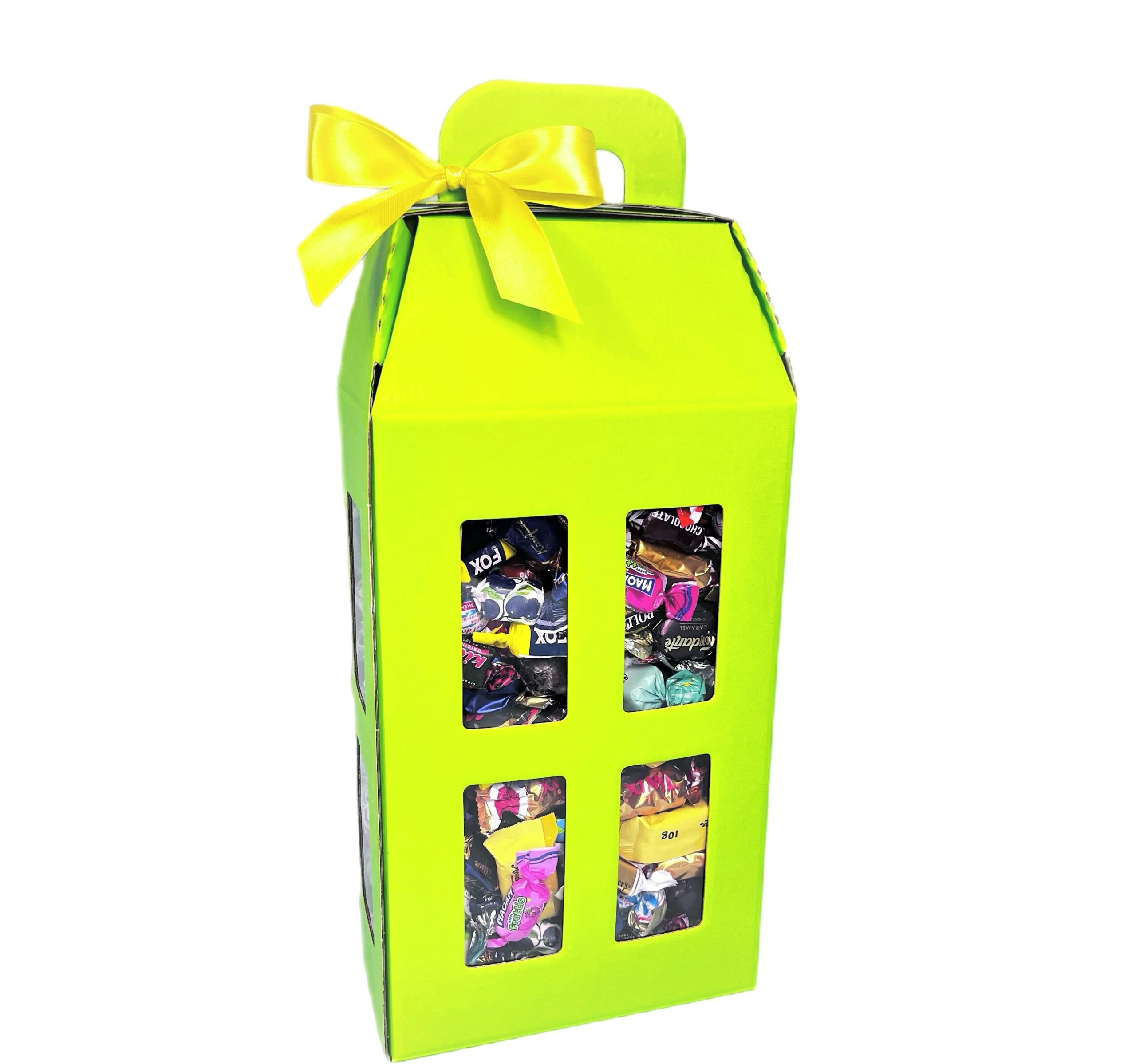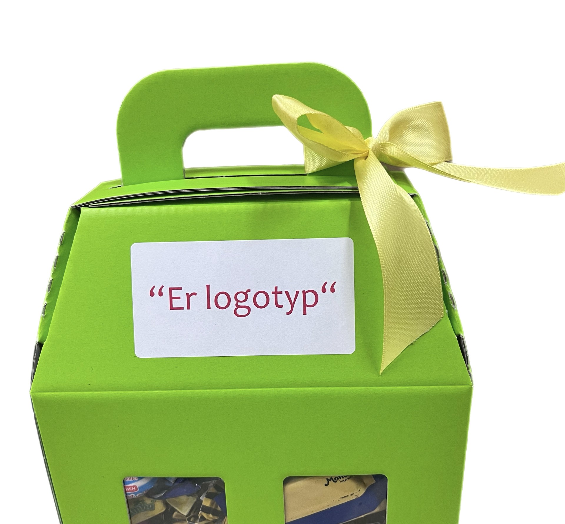 Företag kan få med loggan på taket, på båda sidor. Fylld med den allra godaste konfektyr man kan tänka sig. Godishuset har ett bra bärhandtag på taket. Lätt att ge bort, ännu lättare att äta upp!