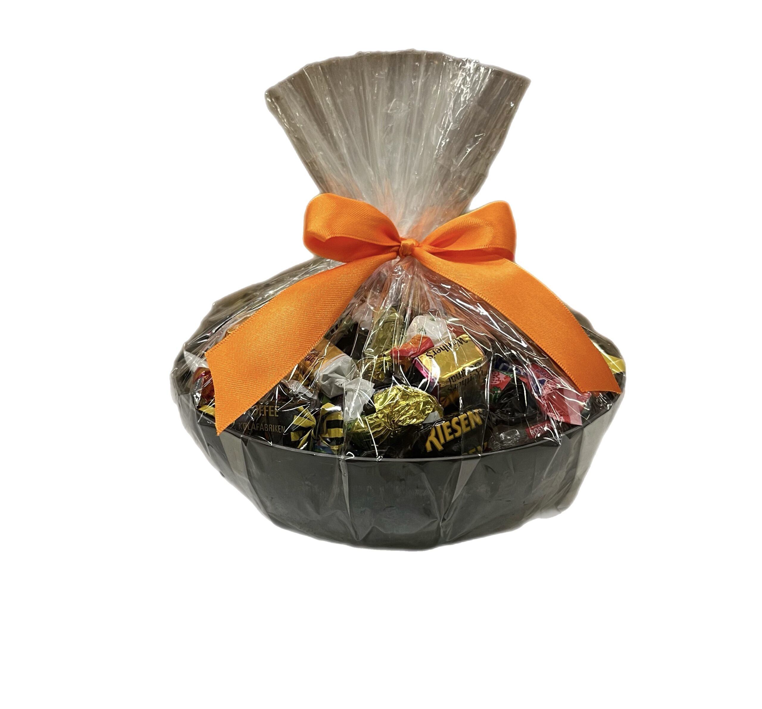 Halloween Godisskål till företaget eller vännen med superfärskt inslaget godis. Detta är en lyxig godisskål som passar bra att ge bort som halloweengåva eller att ställa på det egna kontorets fikabord. Vackert inslagen i cellofan och metervis med snygga svart orangea band.