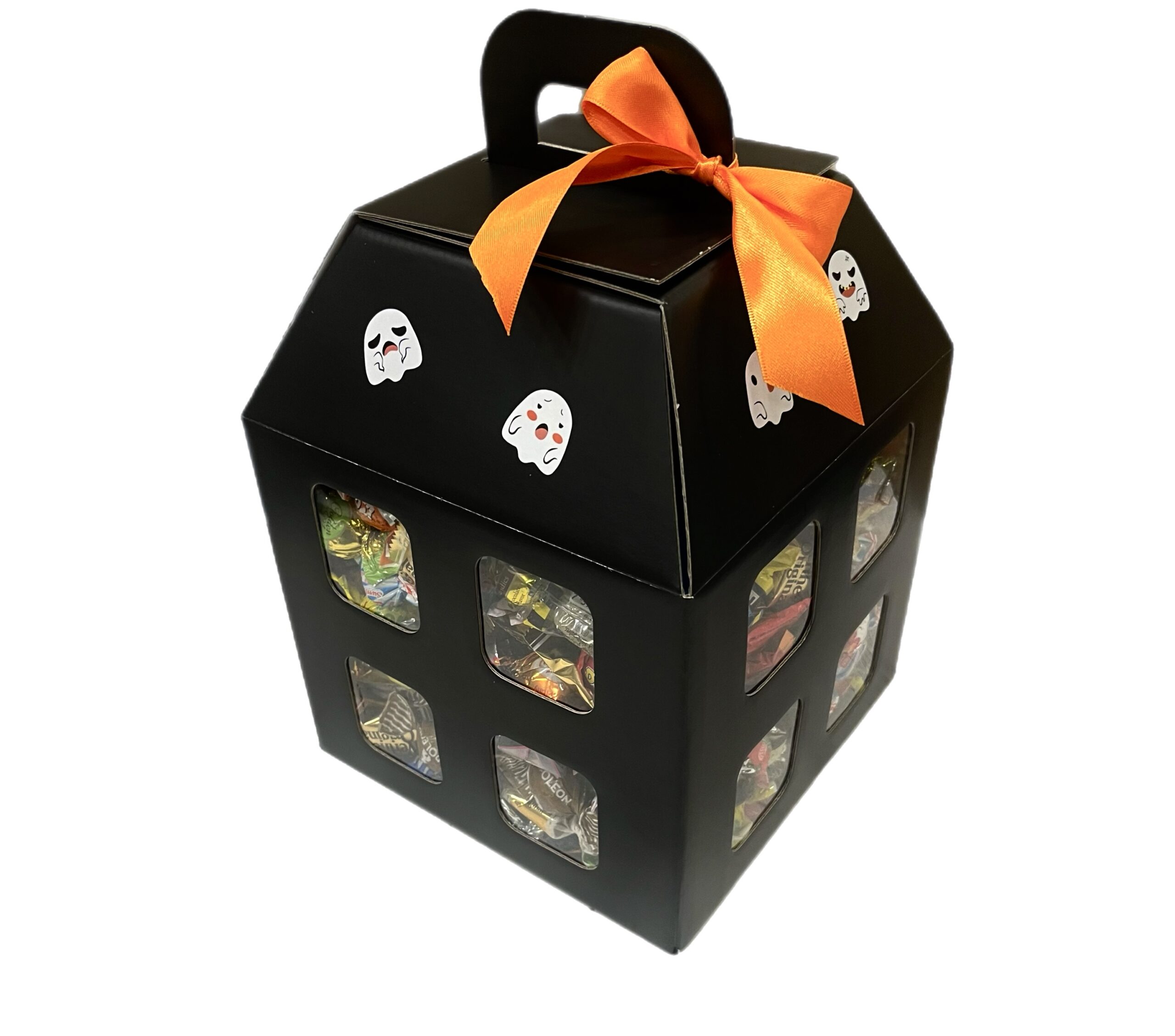 Vårt stora halloween spökhus är mycket populärt och har ett bra bärhandtag på taket. Lätt att ge bort, ännu lättare att äta upp!