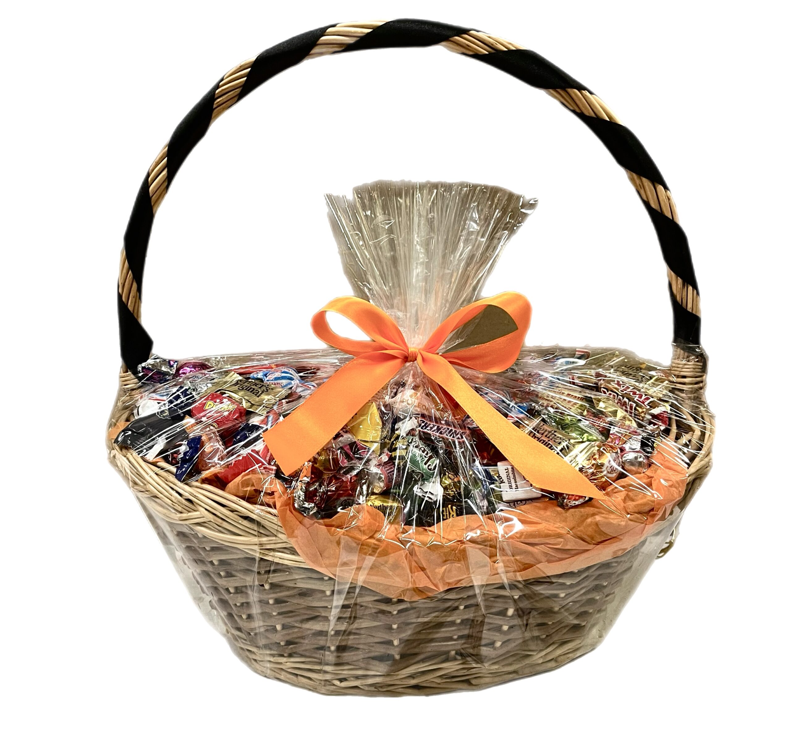 Vår läskiga Halloween Godiskorg är mycket populär. Läskig godiskorg som är spöklikt bra inslagen i cellofan med sidenband. Fylld med den allra godaste konfektyr man kan tänka sig. Korgen har en grepe att bära i. Lätt att ge bort men ännu lättare att äta upp!