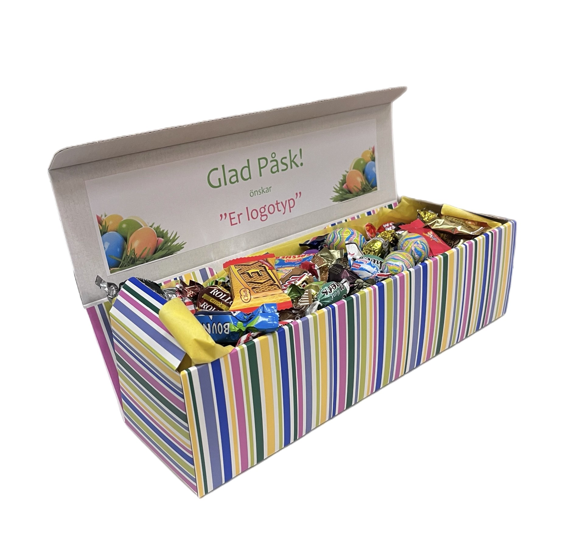 Vem blir inte glad av en påskgåva, fylld till brädden med ljuvligt godis? Skicka gärna med en personlig hälsning. Företag kan enkelt bifoga sin logga.