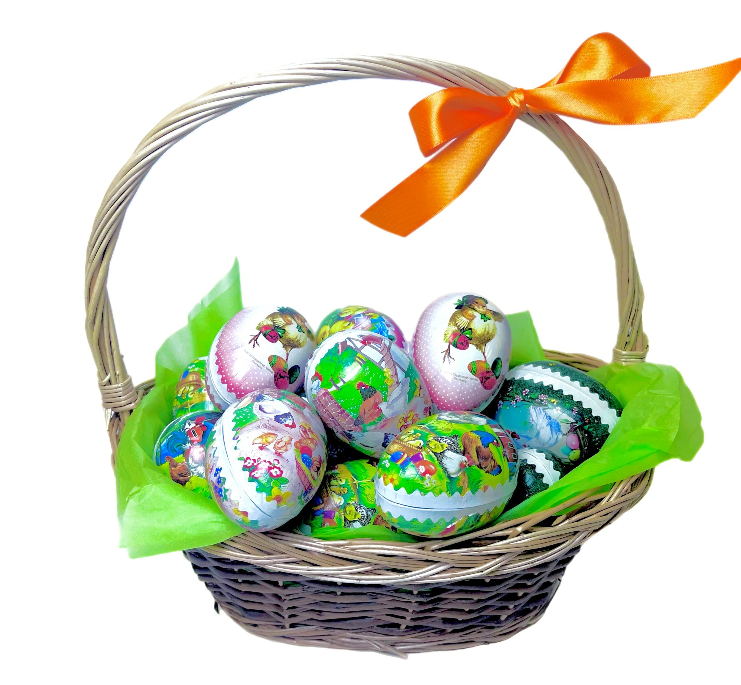 Påskägg i påskkorg  35x21x35cm till grepe. 20st 9cm ägg á 100g. Art 320