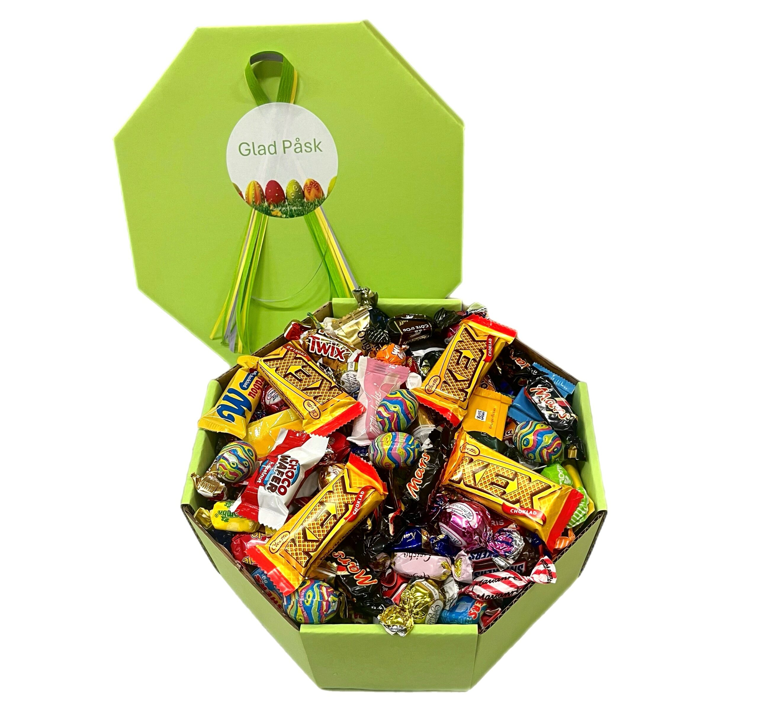 Påsklåda grön åttakantig med 2,5 kg färskt inslaget godis. När man öppnar våra påsklådor blir man alltid lika överraskad. Hur har man fått i så mycket godis?
