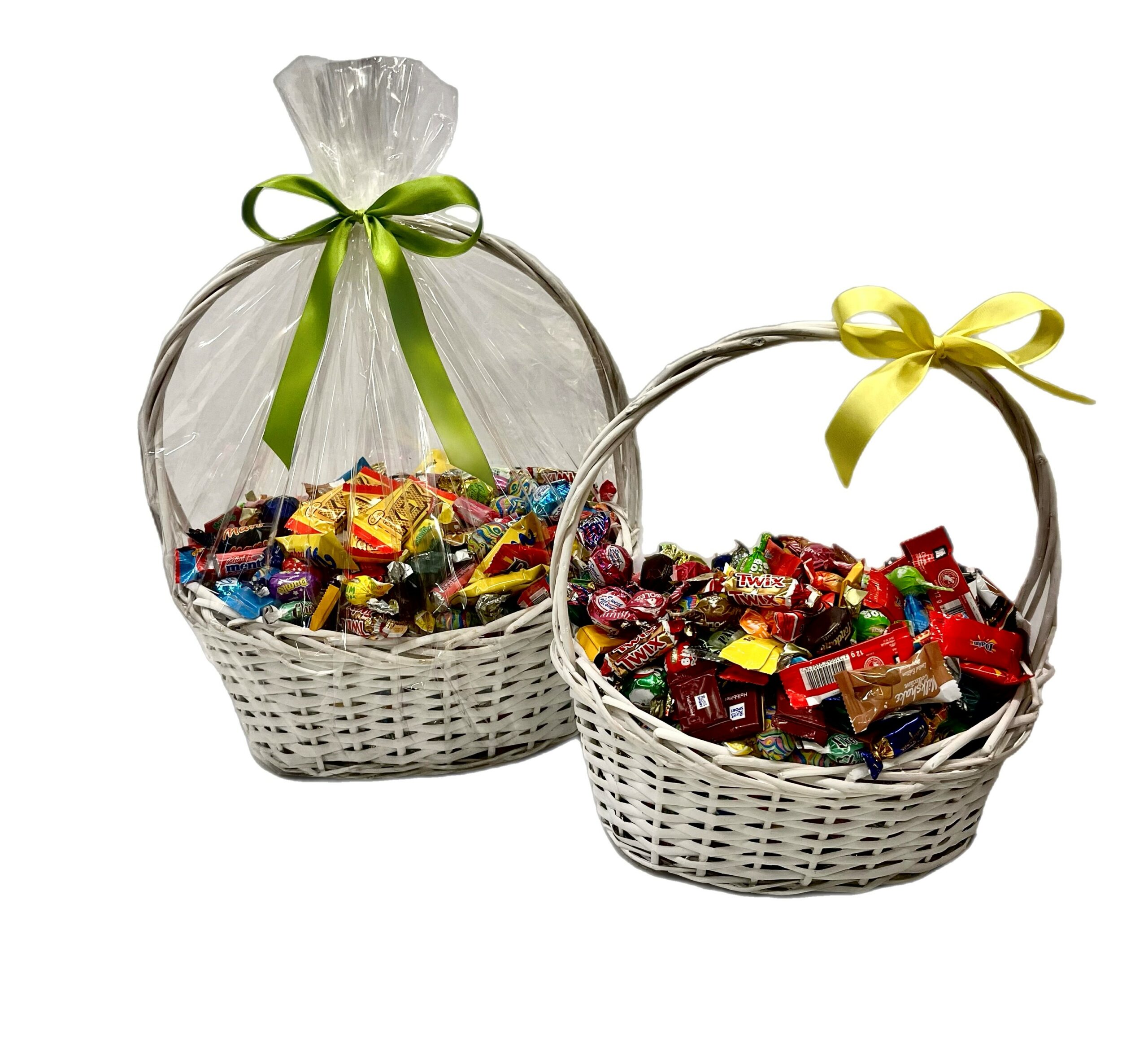 Påskkorgar med sidenband. När man öppnar våra påskkorgar blir man alltid lika överraskad. Hur har man fått i så mycket godis?