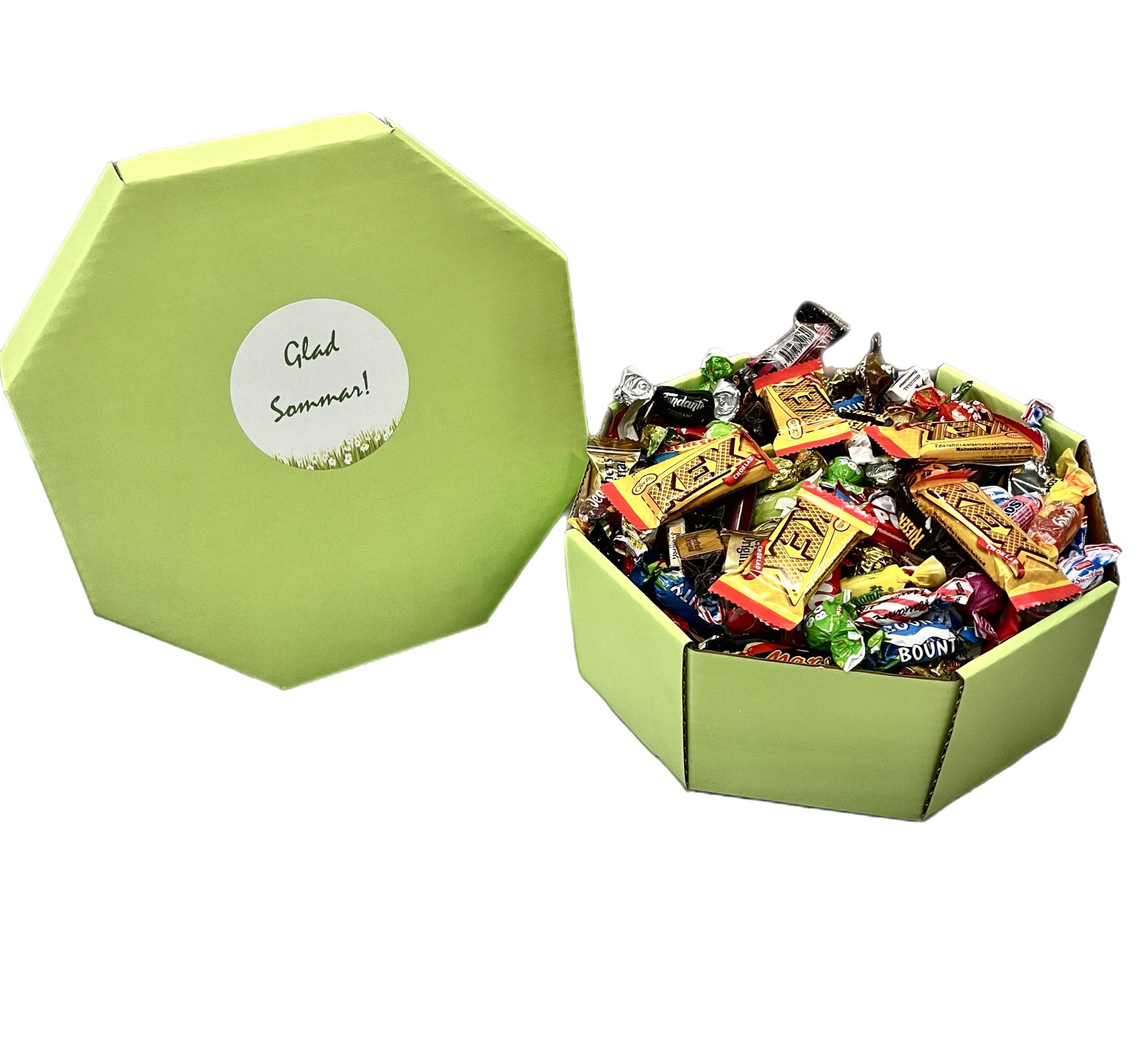 Sommarlåda åttakantig med 2,5 kg färskt godis. När man öppnar våra godislådor blir man alltid lika överraskad. Hur har man fått i så mycket godis?